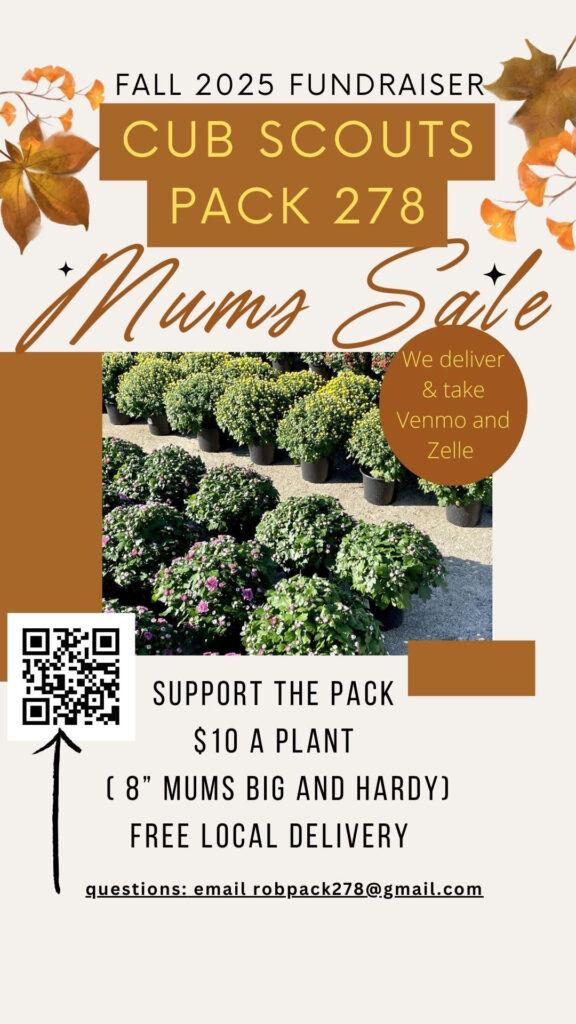 We are selling 8 inch beautiful hardy mums that come in a variety of colors for only $10 each! If you are interested in purchasing them and supporting our pack, then please click here: Google Order Form